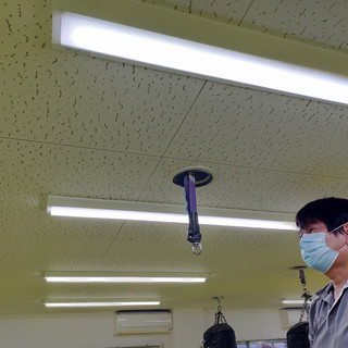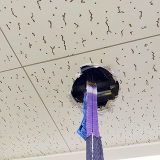 元のホールも工事業者さんに開けて貰ったのですが、予想外にサンドバッグが揺れてそれを吊るすスリングベルトが天井のボードを破壊。